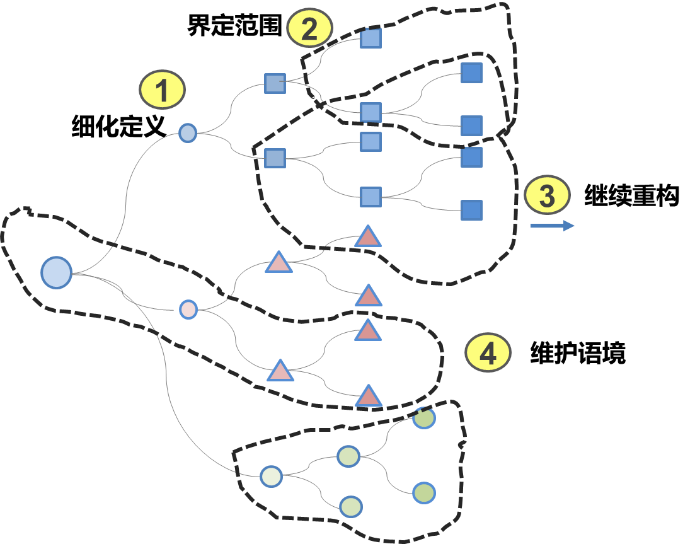 启动具体项目时,我们会体系化地从企业本体中识别并提取相关部分,形成项目专属本体。该范围界定过程不仅明确项目所需的关键元素,也识别出依赖关系、相关法规、利益相关方关切及相关举措的历史背景。生成的项目本体模型为开发工作提供了语义精确的边界,同时保持与企业本体语境的关联,这种方法可以确保资源聚焦于特定的业务能力,且项目符合企业标准规范。
